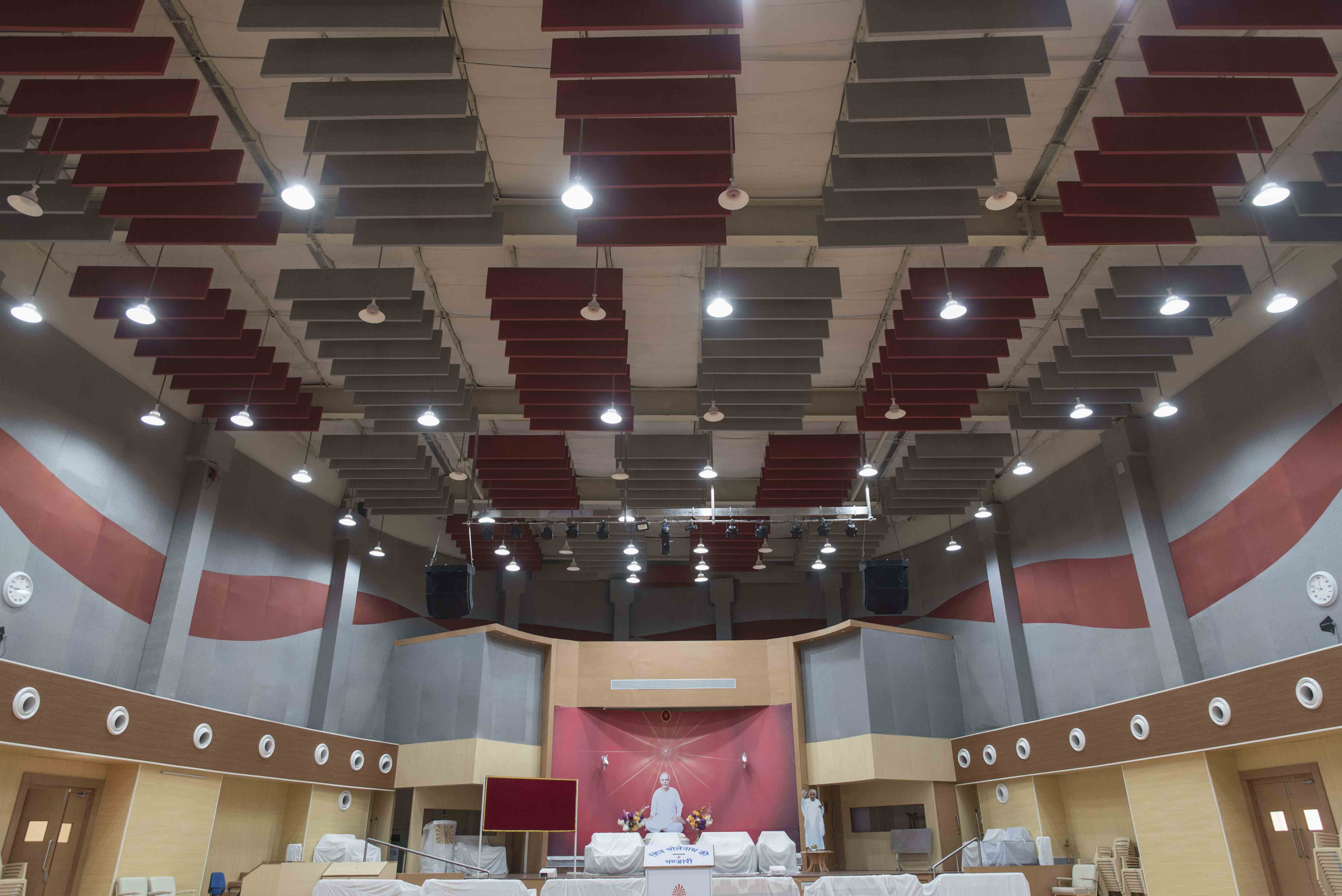 To enhance the radiating effect, we have provided spaces of landscaped terraces in between the outside rooms, surrounding the corridor. The terraces also provides natural day light and fresh air into the corridor and creates a magical picture frames of the farms and mountains around. 2 feet gap has been provided between the second floor corridor and the main central hall, enhancing the double height volume of the hall. The parking area provided underneath also has a grand height where small under roof assemblies can be held occasionally. The open amphitheater which houses 3000 devotees, located on the rear side, is also the highlight of this complex.